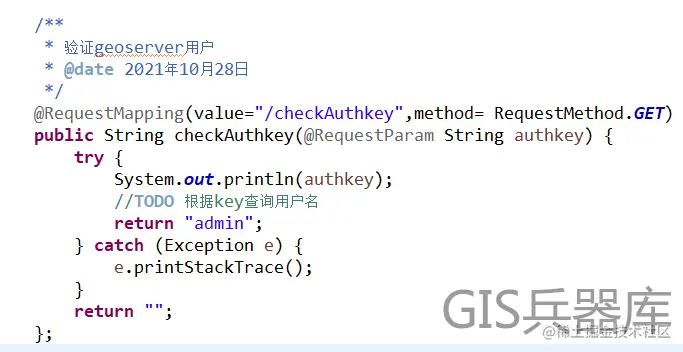 我用java写了个外部接口的示意代码,来大概说明一下里面的逻辑,其实就是根据key获取geoserver用户名