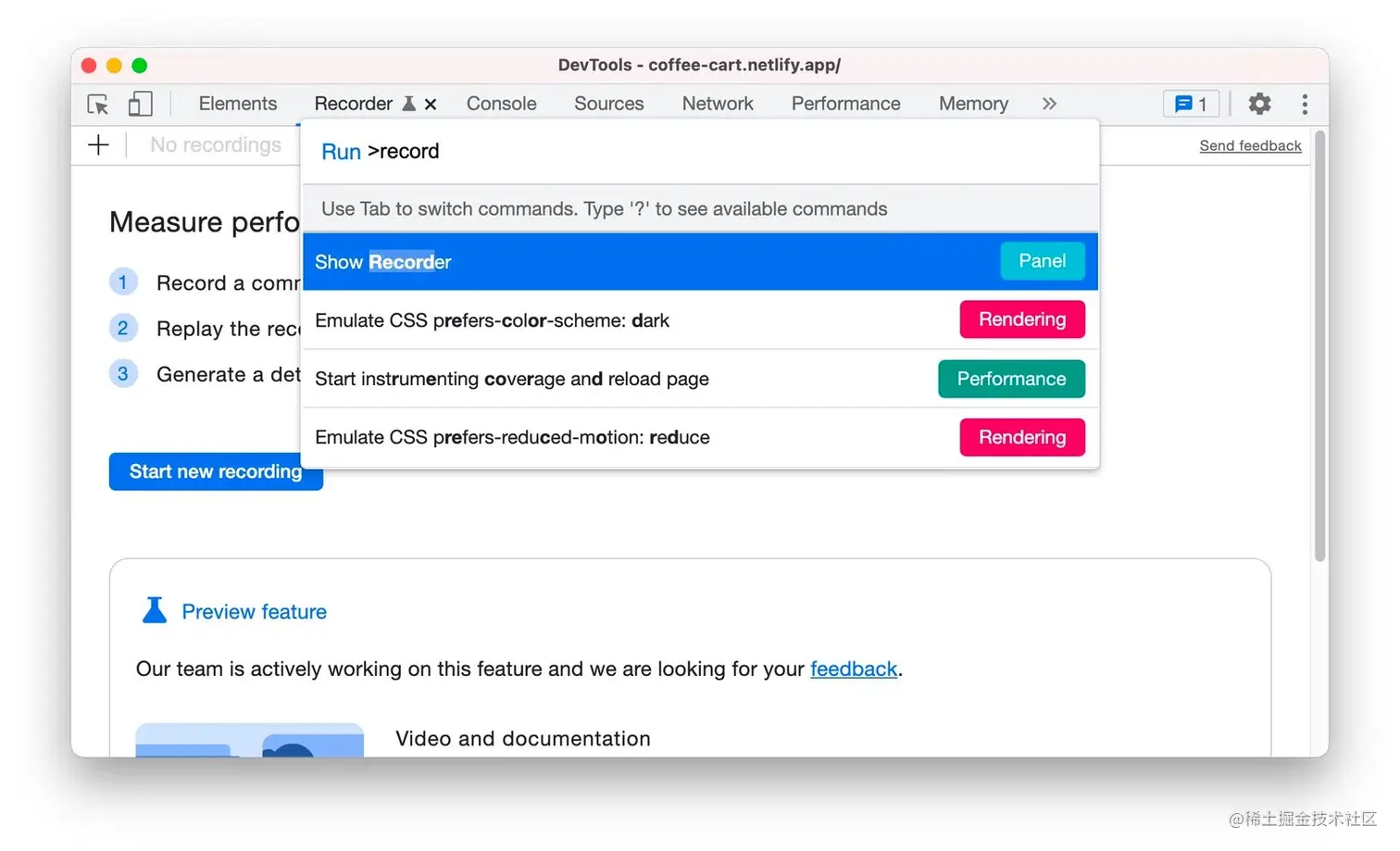 Chrome 97 推出了一个预览功能 - Recorder。它允许你录制 Web 页面的操作并支持回放,编辑,测量性能 等诸多功能。