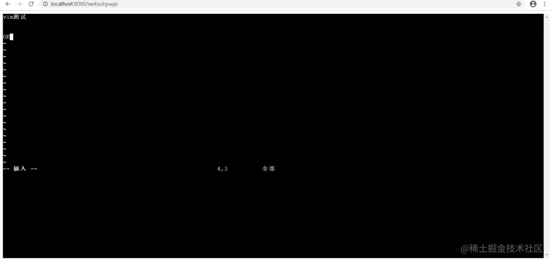 页面的实现很简单,我们只不过需要在一整个屏幕上都显示终端那种大黑屏幕,所以我们并不用写什么样式,只需要创建一个div,之后将terminal实例通过xterm放到这个div中,就可以实现了。