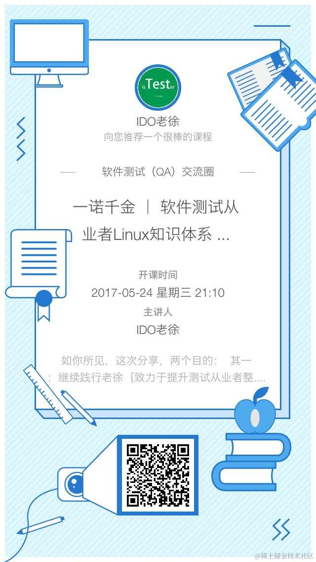 下周,老徐有个《软件测试 Linux知识体系及入门进阶之路》专题分享,有兴趣,可参加。