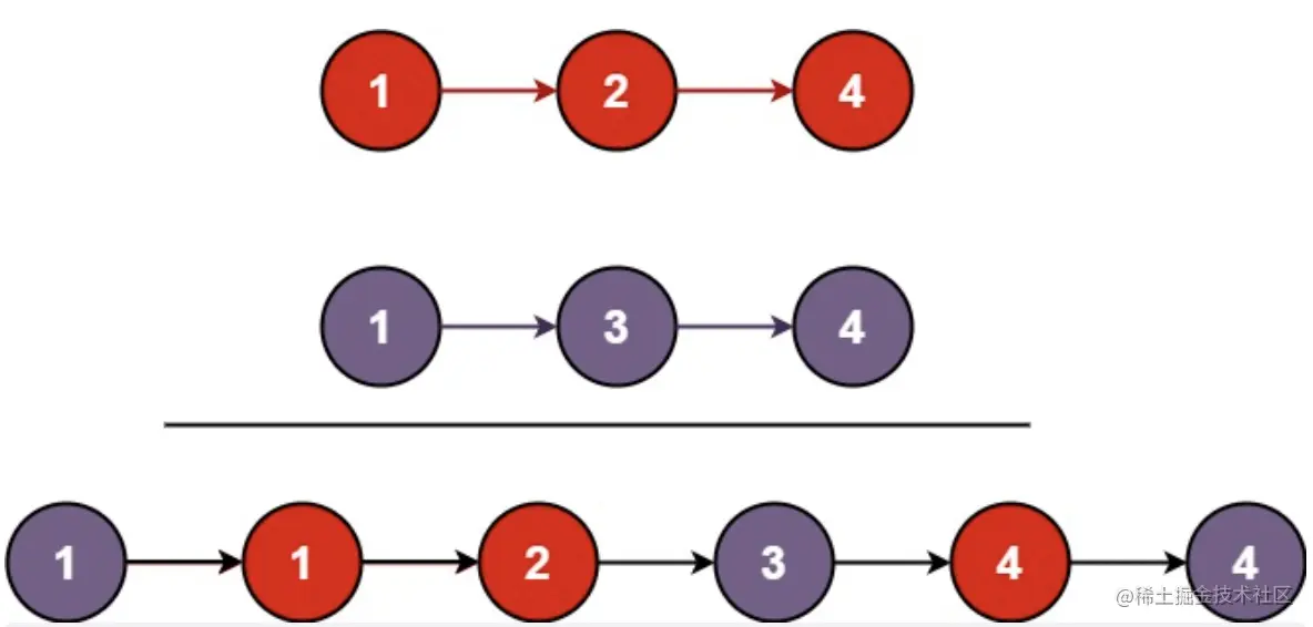 将两个升序链表合并为一个新的 升序 链表并返回。新链表是通过拼接给定的两个链表的所有节点组成的。