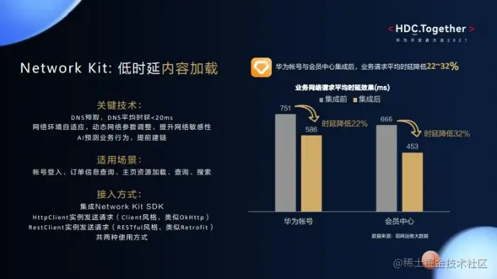 Network Kit针对互联网DNS分配不合理的问题做DNS预取,平均时延小于20毫秒。在弱网环境下,提升网络敏感性,调整动态网络参数,使网络环境自适应。基于AI预测业务行为,提前建链,使短链接开销实现长链接的效果。该能力适用于账号登入、订单信息查询、主页资源查询加载等应用场景。华为账号和华为会员中心集成后,业务请求平均时延降低了22%-32%。