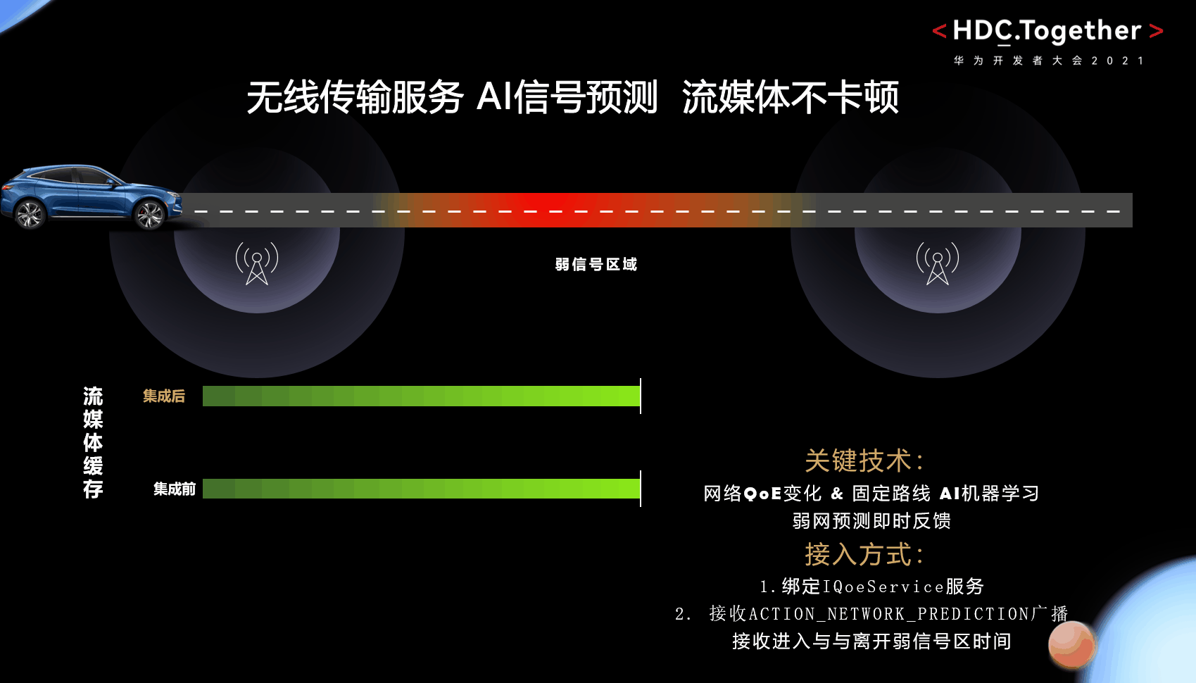 在移动网络的弱覆盖区域,视频类应用经常会出现加载中、卡顿的现象,这就是我们常说的信号黑洞。今年,无线传输服务推出了AI信号预测能力,使流媒体不再卡顿。如下图一辆车行驶在一段路径上,集成前经过弱信号区域时刷视频会卡顿,集成后在网络QoE(用户感知)变化、固定路线、AI机器学习的关键技术支撑下,可以进行弱网预测的及时反馈,提前缓存流媒体。