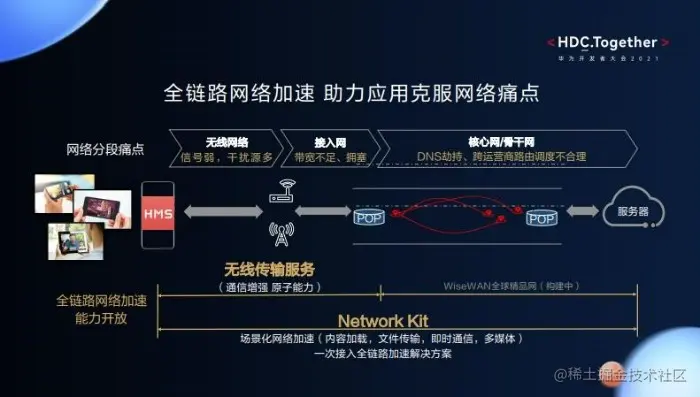 全链路网络加速能力开放后,无线传输服务作为原子能力可以增强通信,对抗网络干扰。Network Kit一次接入全链路加速解决方案,在内容加载、文件传输、即时通信、多媒体等场景助力网络加速。WiseWAN全球精品网也正在构建中。