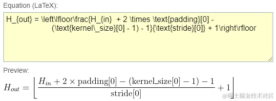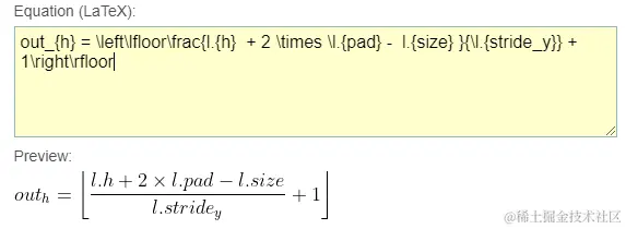 以上的计算公式为 LaTeX 格式,这是一种基于 TEX 的排版系统,由美国计算机学家莱斯利-兰伯特发明,利用这种格式,能够快速生成复杂表格和数学公式。不过这种格式对于我们来说可读性比较差,这里用富本编辑器的 公式 功能转换一下,来看 H_{out}: