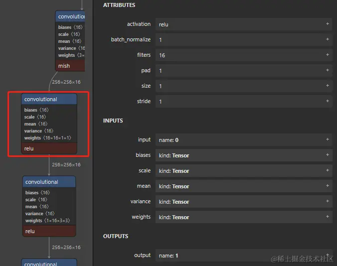 来看框出来的层,以 n c h w 布局的话输入为 [n , 16, 256, 256],从可视化看到经过这个卷积后的 shape 依旧为 [n, 16, 256, 256],如果我们以 pytorch 的计算方式:Hout = (Hin + 2 * padding - (size - 1) - 1) / stride + 1 来计算的话,你可能会认为 pad 即为 padding,则 Hout = (256 + 2 - (1 - 1) -1) / 1 + 1 = 258,此时得到的结果显然不对,故这种计算方式存在问题。我们改用 darknet 中的计算方式,即把 pad 当作标志位,先计算 padding,这里算子参数里没有写 padding,则令 padding = 0,计算过程如下: