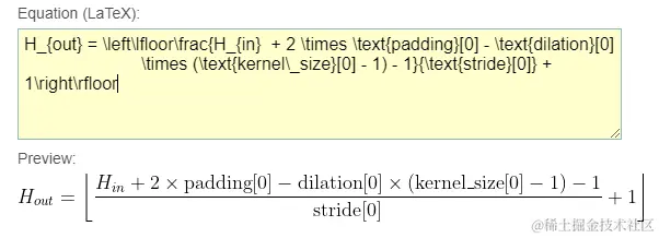 H_{out} = \left\lfloor\frac{H_{in} + 2 \times \text{padding}[0] - \text{dilation}[0]