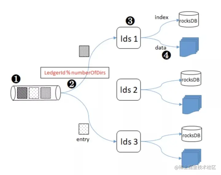 - Netty 线程会依次从队列中获取每一个 entry,根据该 entry 的 ledgerId 进行取模,选择写入的目标磁盘(ledger 盘)。取模算法为: