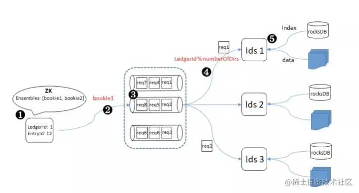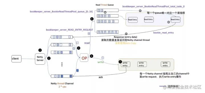 - bookie1 收到 read entry 请求后,根据 ledgerId 进行 hash,选择对应的 readerThread,并将请求放入该 readerThread 的请求处理队列。