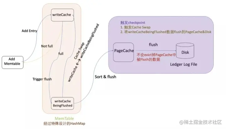 ledgerId % numberOfLedgers取模,选择 entry 所在的目标 Ledger 磁盘实例。 - 检查该 Ledger 实例对应的 MemTable(writeCache 和 WriteCacheBeingFlushed)中是否存在想要读取的 entry(按照 <ledgerId, entryId> 为 Key,从索引中查询,时间复杂度为 O(1))。如果 cache hit,直接返回 entry。