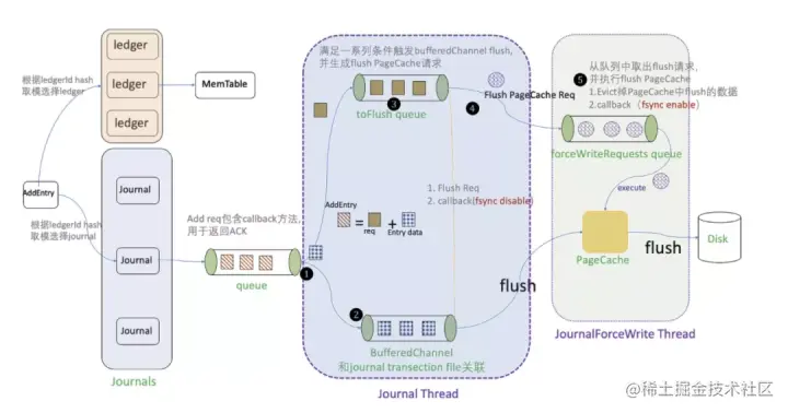 - 将 QueueEntry 中 entry data 剥离出来,写入 BufferedChannel(每个 journal file 对应一个 BufferedChannel。当上一个 journal file 滚动时,需要创建下一个 journal file 并与新的 BufferedChannel 进行关联)。