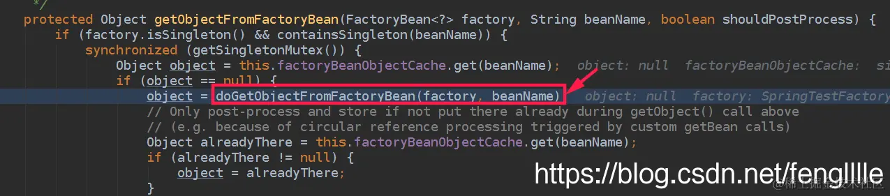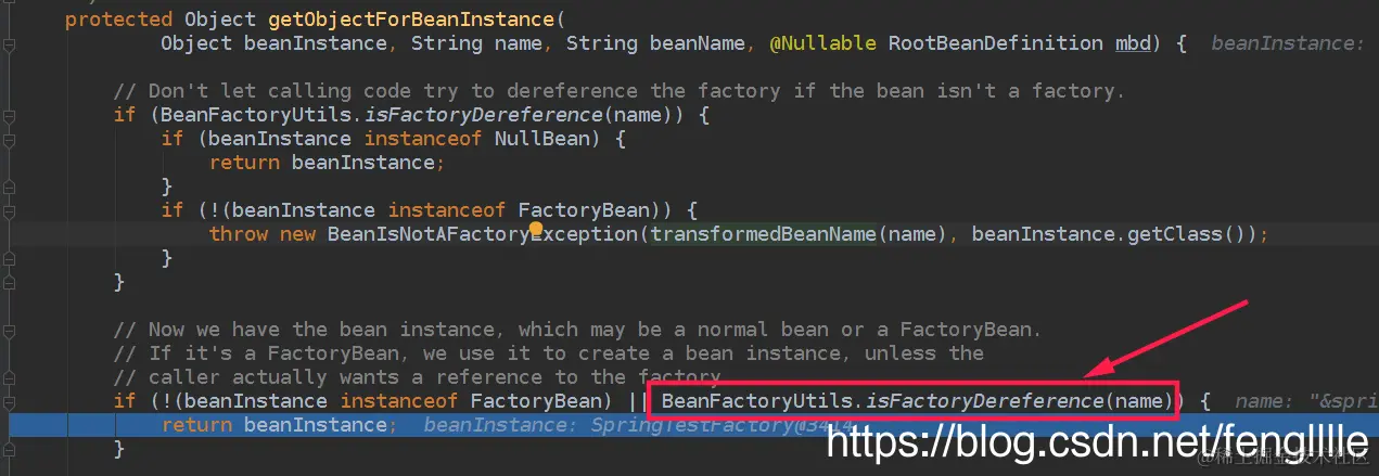 //以&开头的beanName才会创建factoryBean的对象,否则创建factoryBean的实现方法getObject的对象,在下面的代码会分析