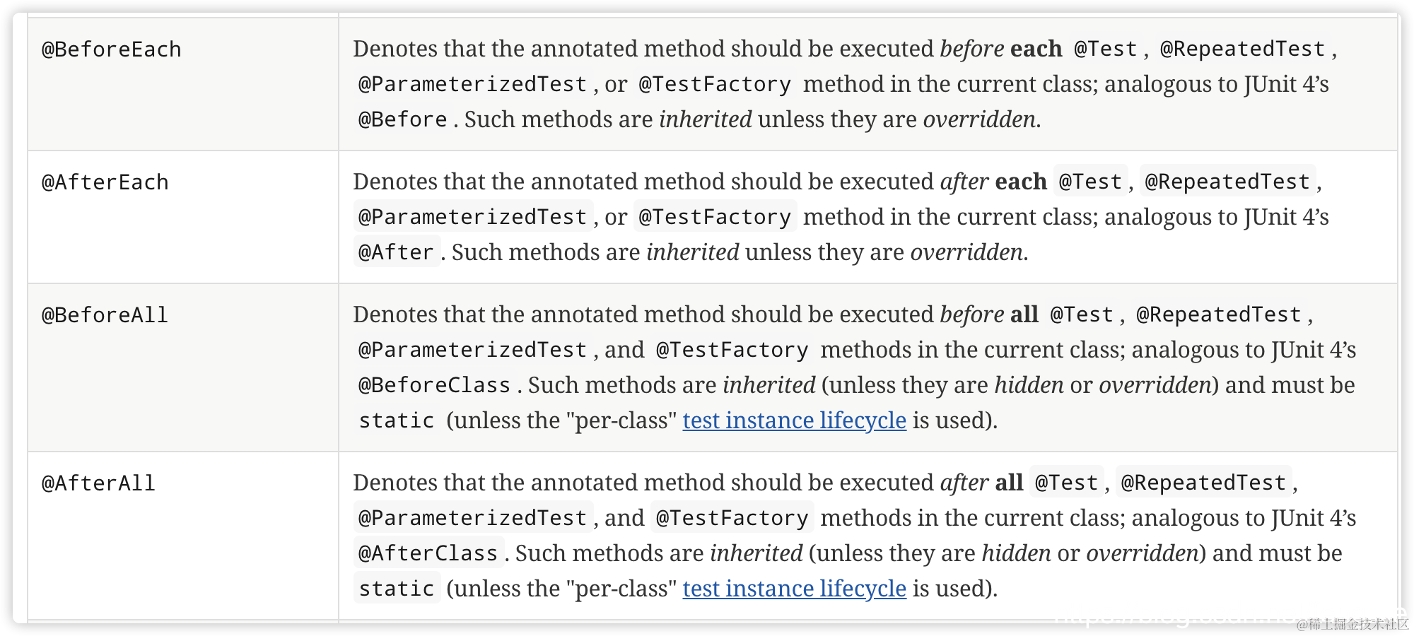 Junit5的官方文档有很详细的介绍:Junit5;常用的注解是@Before与@After