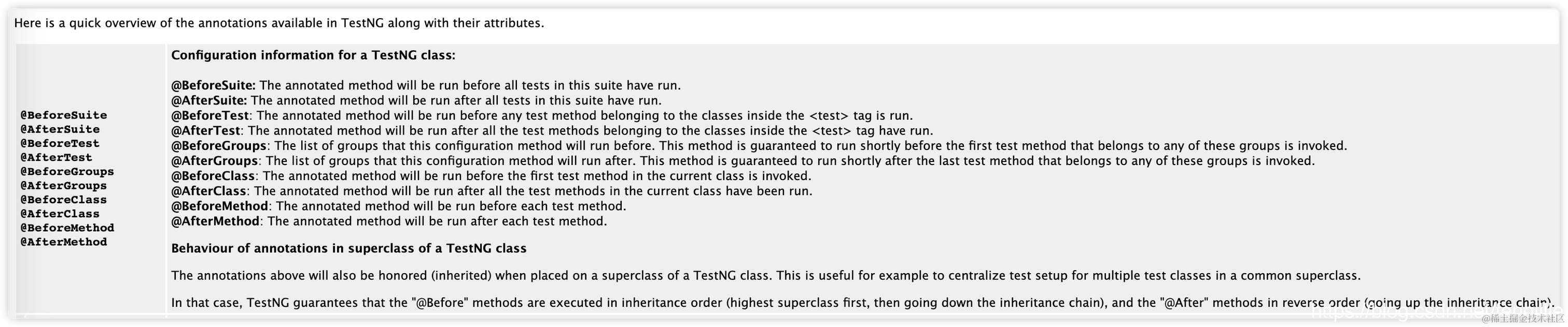 TestNG : 即Testing Next Generation,用JDK的annotation技术来强化测试功能,借助XML 文件强化测试组织结构而构建的测试框架。笔者也没使用过,有官方文档:testng.org/doc/documen…;据说功能更强大,支持xml方式。