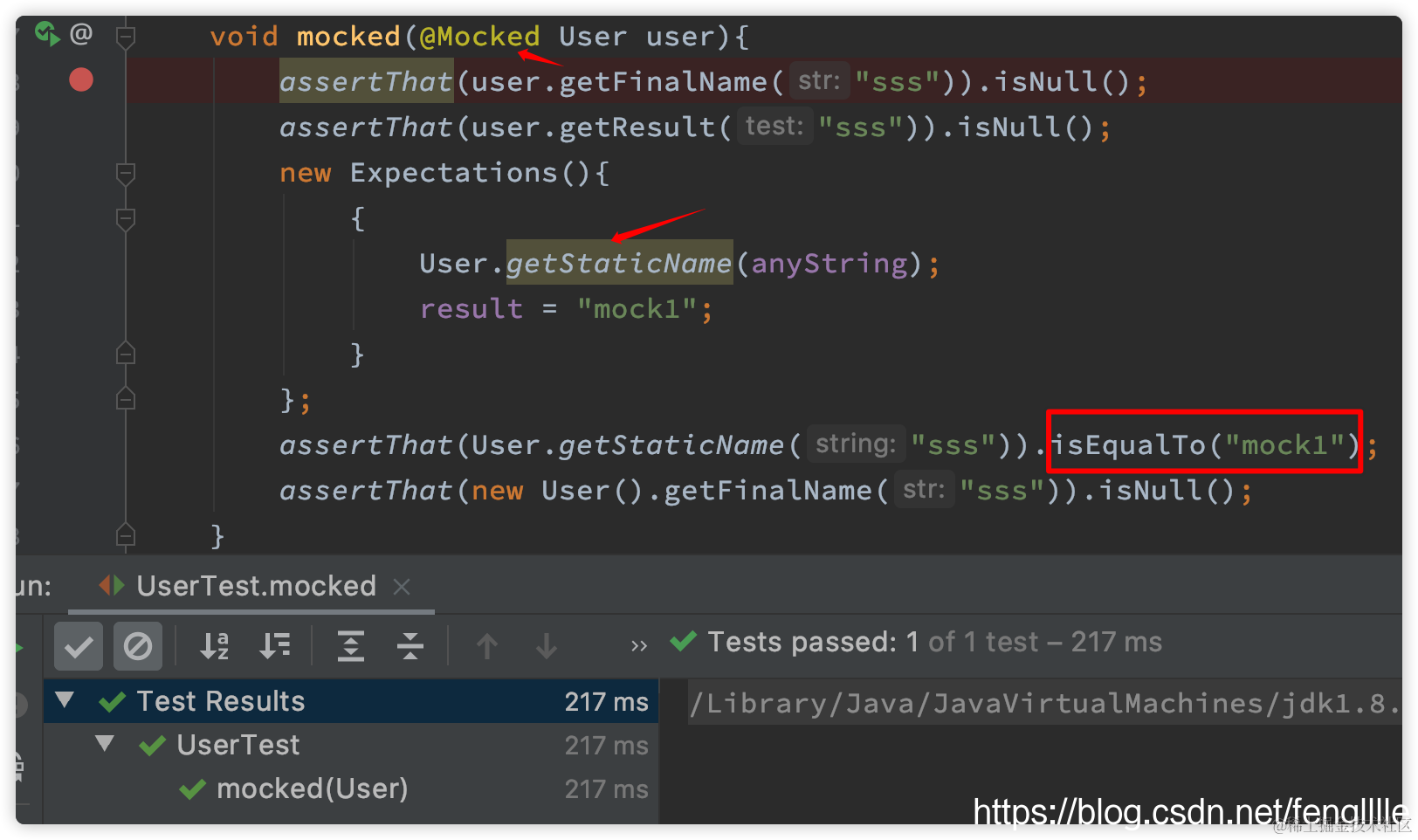 assertThat(demoService.getMapperData("sss")).isNotBlank().isEqualTo("JMockit");