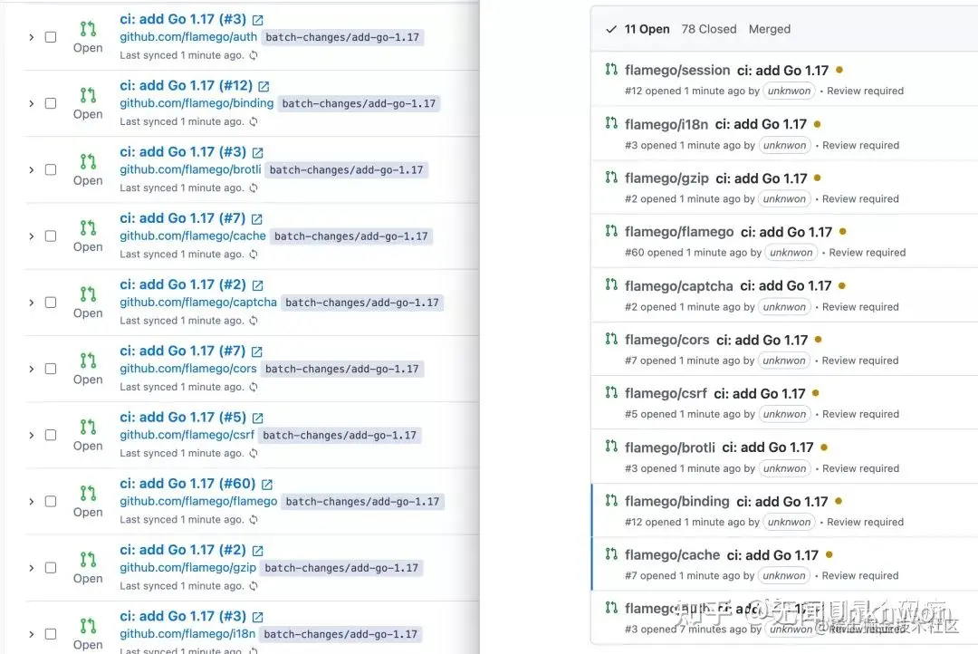 在我把所有的变更都发布了之后,对在 Batch Changes UI 和 GitHub.com 上的 Pull Request 列表进行了对比: