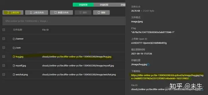 - 上传一个图片hug.jpg,然后点击hug.jpg弹出侧边栏,复制一下下载链接