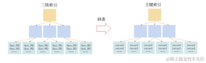 当通过使用二级索引来查询数据时,通过二级索引先找到主键值,再通过主键索引进行查询数据,这种二级索引通过主键索引进行再一次查询”的操作叫作回表。