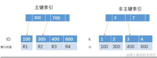 select * from table where k = 1,以非主键的查询方式,则需要先搜索 k 索引树,得到 ID=100,再到 ID 索引树搜索一次,这个过程也被称为回表。