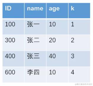 假设我们有如下表,ID是主键,字段 k 上有索引: