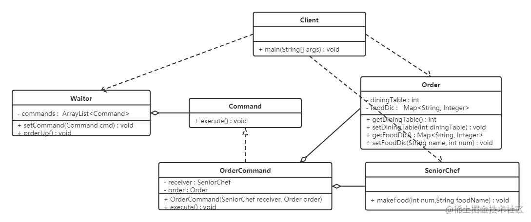 - 调用者/请求者(Invoker)角色: 要求命令对象执行请求,通常会持有命令对象,可以持有很多的命令对象。这个是客户端真正触发命令并要求命令执行相应操作的地方,也就是说相当于使用命令对象的入口。