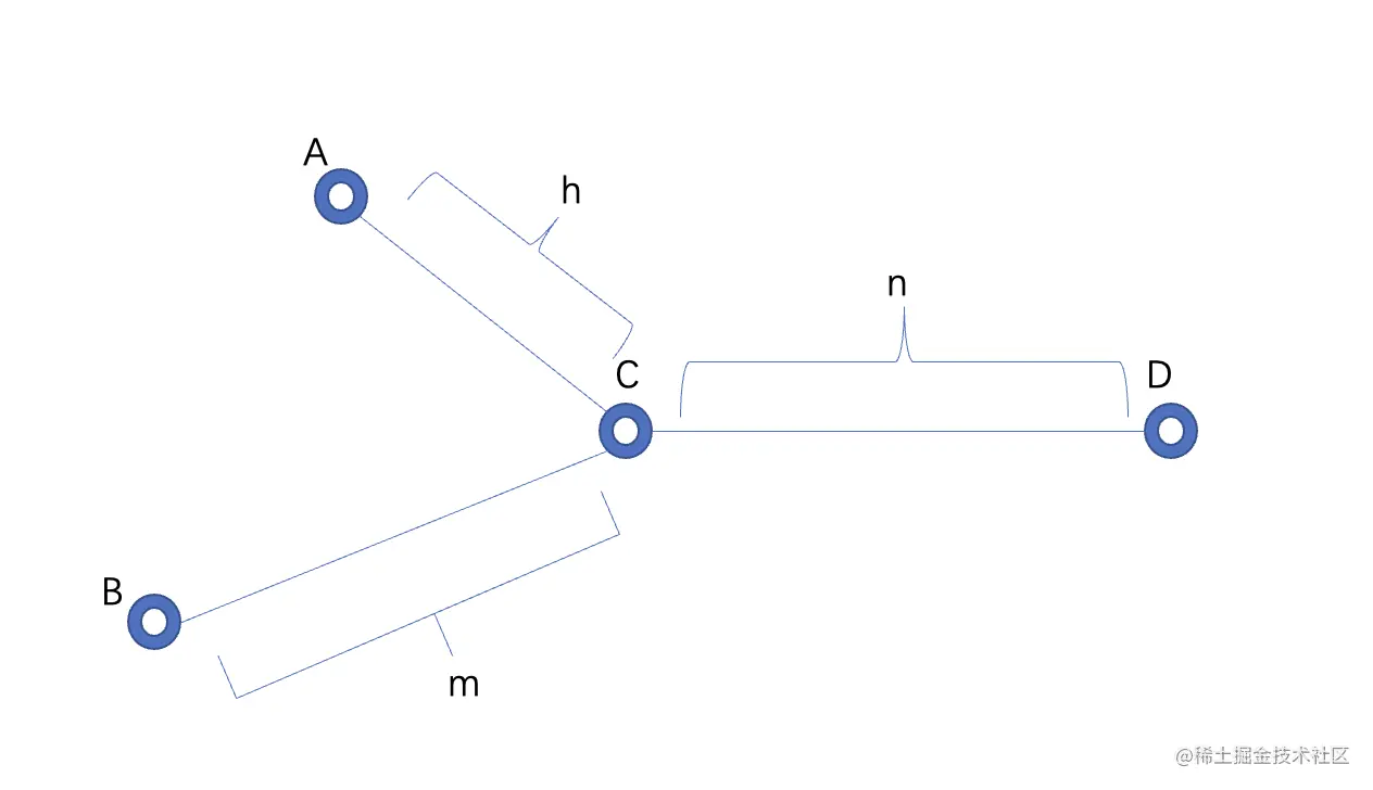A跑步的路径是(A -> C -> D) + (B -> C) ,长度为h + n + m