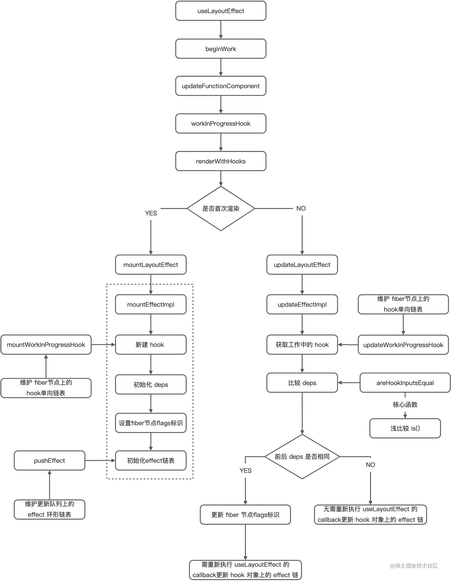 可见,updateEffectImpl 最主要的作用,就是通过比较前后的 deps,判断是否是需要重新执行 useLayoutEffect 的 callback。