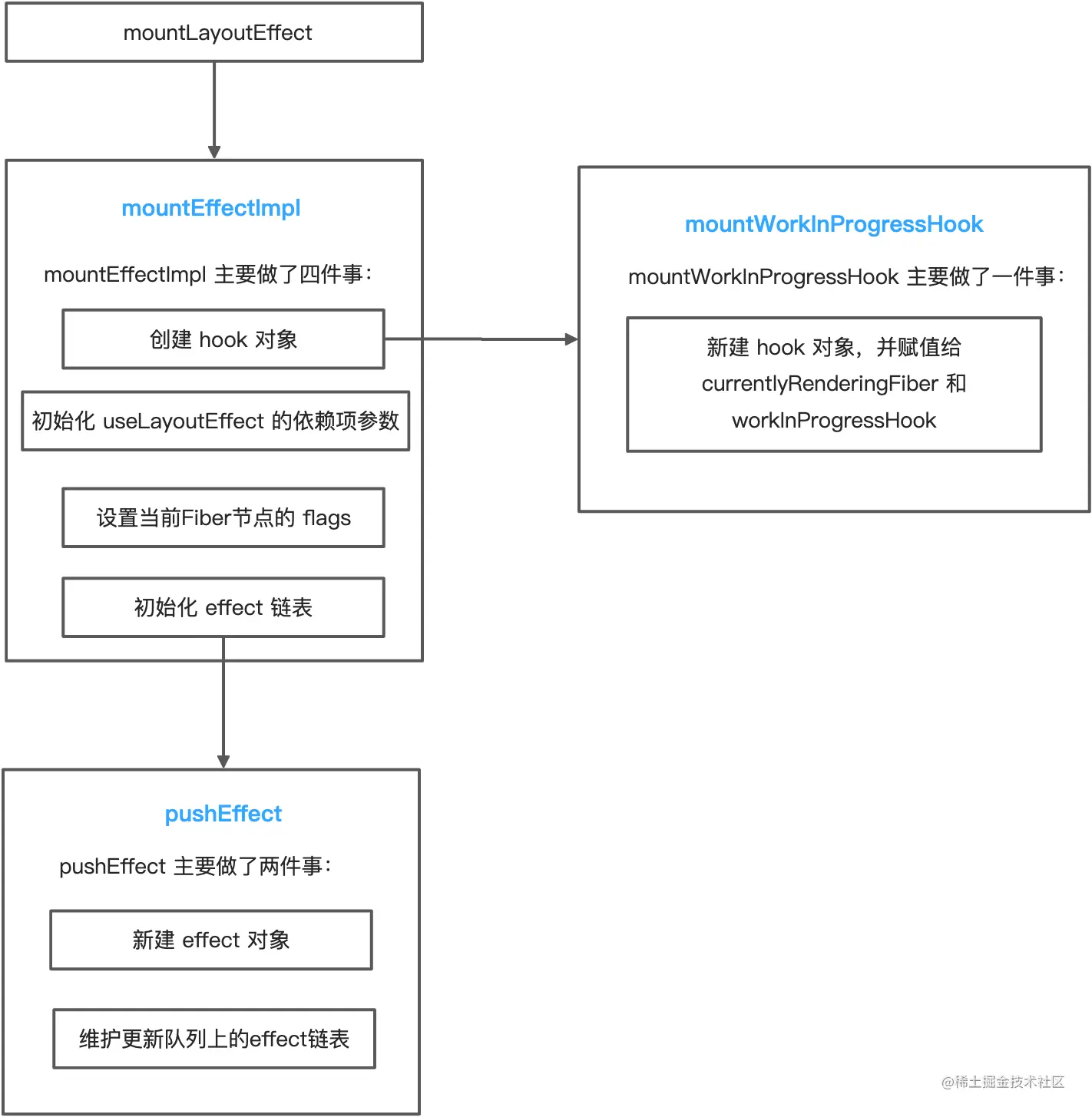 在挂载阶段,执行 useLayoutEffect,实际上执行的是 mountLayoutEffect,我们来看看 mountLayoutEffect 的实现。