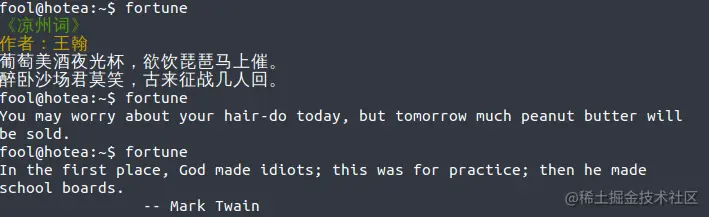 输出一句话,有笑话,名言什么的 (还有唐诗宋词sudo apt-get install fortune-zh)