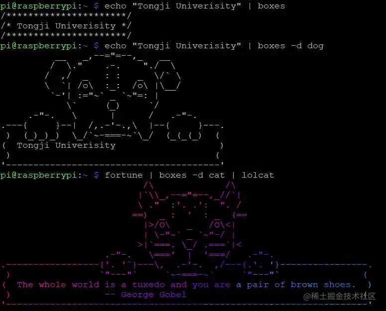 艺术字生成器,由ASCII字符组成,把文本显示成标题栏。此外还有banner这个命令