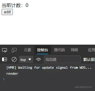 最开始时,页面显示count的值为0,控制台打印出render,这是 React 首次渲染时打印的。当点击完按钮后,页面显示count值是1,同时也只打印了1个render,说明在这过程中 React 只执行了一次setState,只执行了一次render()渲染操作。