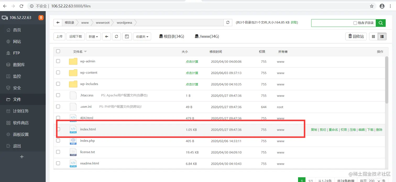 解决2:回到宝塔,wp所在文件的目录,把index.php挪到index.html前