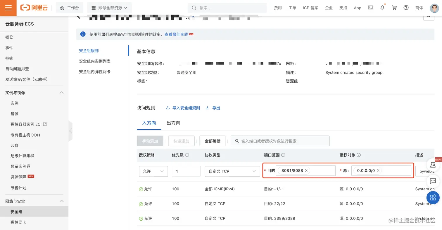 在配置规则页面,点击手动添加,然后输入安全组相关信息,除了端口访问写为8081/8088(后面还可以部署其他应用),授权对象为0.0.0.0(所有ip可以访问),其他的默认设置即可。