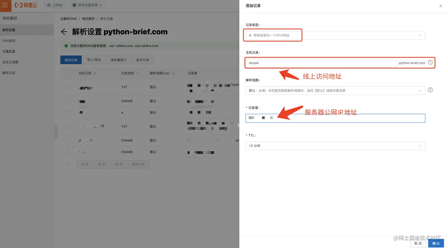 - 记录值:就是要将域名映射到哪个地方,这里我们写我们服务器的公网ip地址(在3.2中有介绍)
