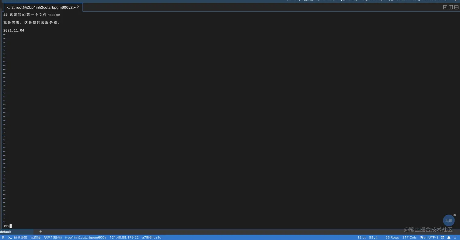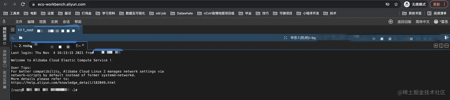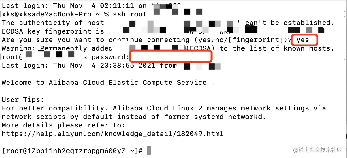 当然,我们其实也能在终端连接阿里云服务器,直接通过ssh即可,如下所示,mac打开终端(windows的话打开cmd),输入下面指令即可连接成功后,我们后面都不用打开浏览器去阿里云服务器后台了~
