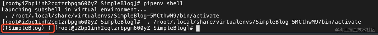 pipenv shell即可进入虚拟环境,进入后前面会有一个标志SimpleBlog。
