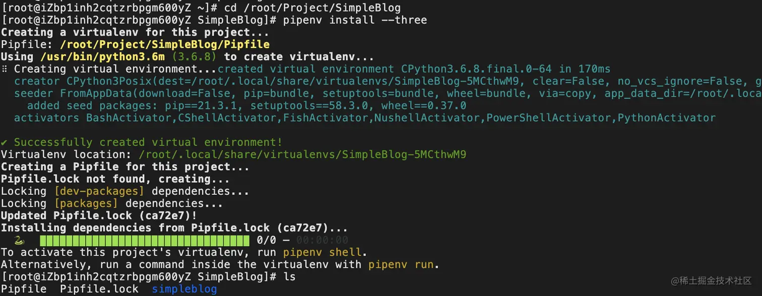 在服务器中,进入/root/Project/SimpleBlog目录,需要先安装虚拟环境管理包pipenv,直接输入pip3 install pipenv即可。