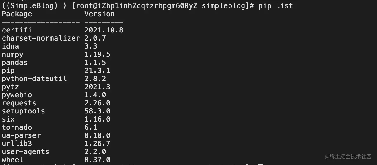 在服务器中,我们直接运行下面命令启动应用:(注意是在虚拟环境中,且在/root/Project/SimpleBlog/simpleblog目录中)