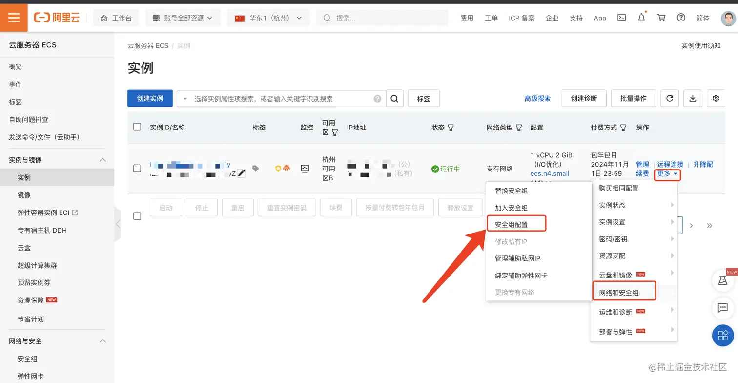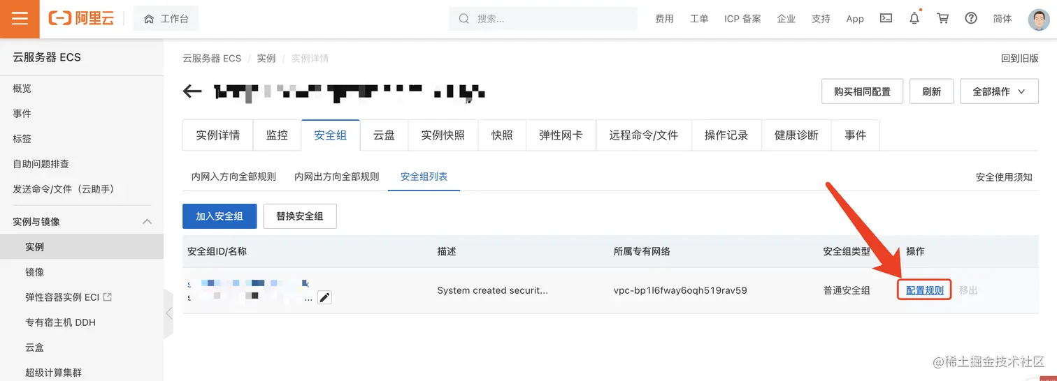 我们进入阿里云服务器后台,进入实例,点击更多 -> 网络和安全组 -> 安全组配置,