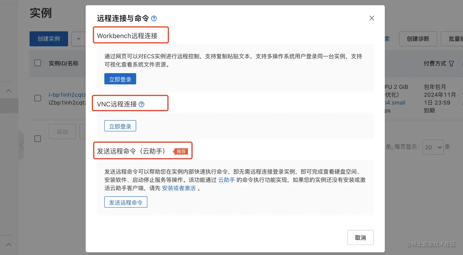 我们点击远程链接,会发阿里云上提供了三种远程连接方式: