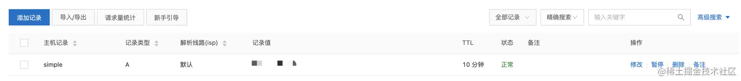 购买后,登录阿里云域名管理后台,点击对应域名后面的解析,即可进入域名解析页面(每个解析可以理解为一个映射,从我们的域名映射到记录值)。