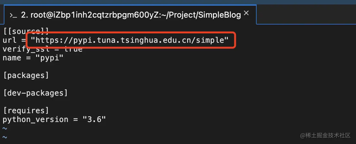 Pipfile,在文件里可以设置第三方包下的镜像源,我们更改为清华的镜像源,地址:pypi.tuna.tsinghua.edu.cn/simple (vim使用在3.4中有介绍)