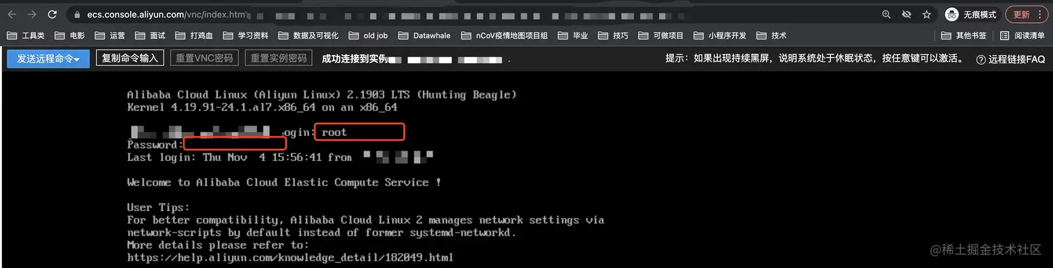 VNC远程连接:需要输入我们设置的VNC远程连接密码,进入后还需要输入实例用户名(默认root)和密码,主要用于不能直接用Workbench远程连接的场景。同上,忘记了就重新设置就行,很简单;