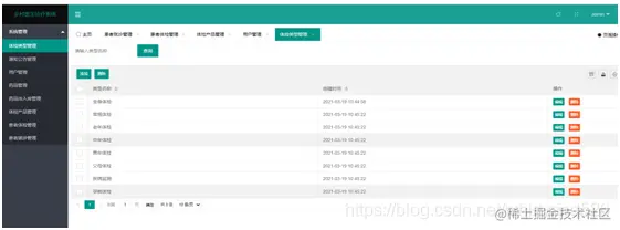 如图3.15所示,体检类型模块可以修改添加体检的类型,如老年体检、中年体检等,进行更有针对性的体检操作。在后端进行操作后,前端体检页面也会进行相应的修改。