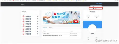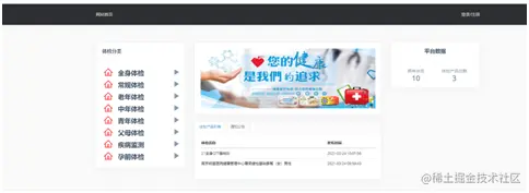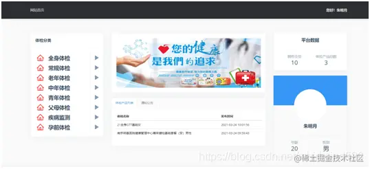 如图3.6所示,登录成功后进入体检主页面,右上角显示用户姓名,点击姓名后有个人信息和退出两个选项,左侧显示体检的类型,有全身体检、老年体检等类型。中间可以查看体检的名称,点击体检名称可以查看详细的体检内容,更全面的了解这项体检产品,体检人员可以按照自己的需求进行选择。同时,用户也可通过通知公告来了解实时动态,可以更方便的服务用户。右侧上方的平台数据显示拥有会员数,这个是统计了所有注册体检系统的人数,也记录了体检产品的总数量。平台数据下方有体检人员的个人信息,包括姓名、年龄、性别等。