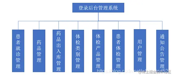 医生登录后台管理模块,分别有患者就诊管理、药品管理、药品出入库管理、体检类型管理、体检产品管理、用户管理、患者体检管理、通知公告管理等模块。在患者就诊时添加电子医疗处方笺,增删改查,对于处方可以打印或导出备份,以备不时之需。对于药品方面,药品信息和出入库有着明确的记录,以便医生快速地查找了解。当申请体检人员预约好体检后,医生就会在患者体检管理模块收到记录,日后可以上门体检。如图2.4所示,为后台管理模块流程图。