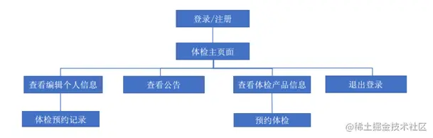 如图3.1所示,当用户想要预约体检时,登录体检系统就可以预约体检。如果是新用户,需要先注册,在注册页面输入账号、密码、姓名等一系列信息,点击提交,会显示注册成功。注册时带有账号校验,如果账号重复,则会通知账号重复,请重新输入账号。注册成功之后,重新登录,登录界面后来到体检主页面。