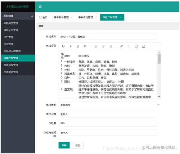 如图3.14所示,修改体检产品时点击操作中的编辑按钮,对想要修改的内容进行编辑,编辑成功后保存,重新发布产品,用户在前台就可以看到修改后的产品信息。